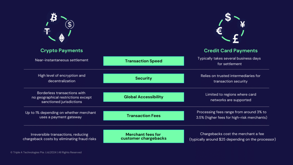 Crypto payments are fast, secure and cost-effective, and offer many additional benefits for both your business and your customers. The table below outlines the key differences between crypto payments and card payments, and shows how crypto payment methods often outperform their traditional counterparts.