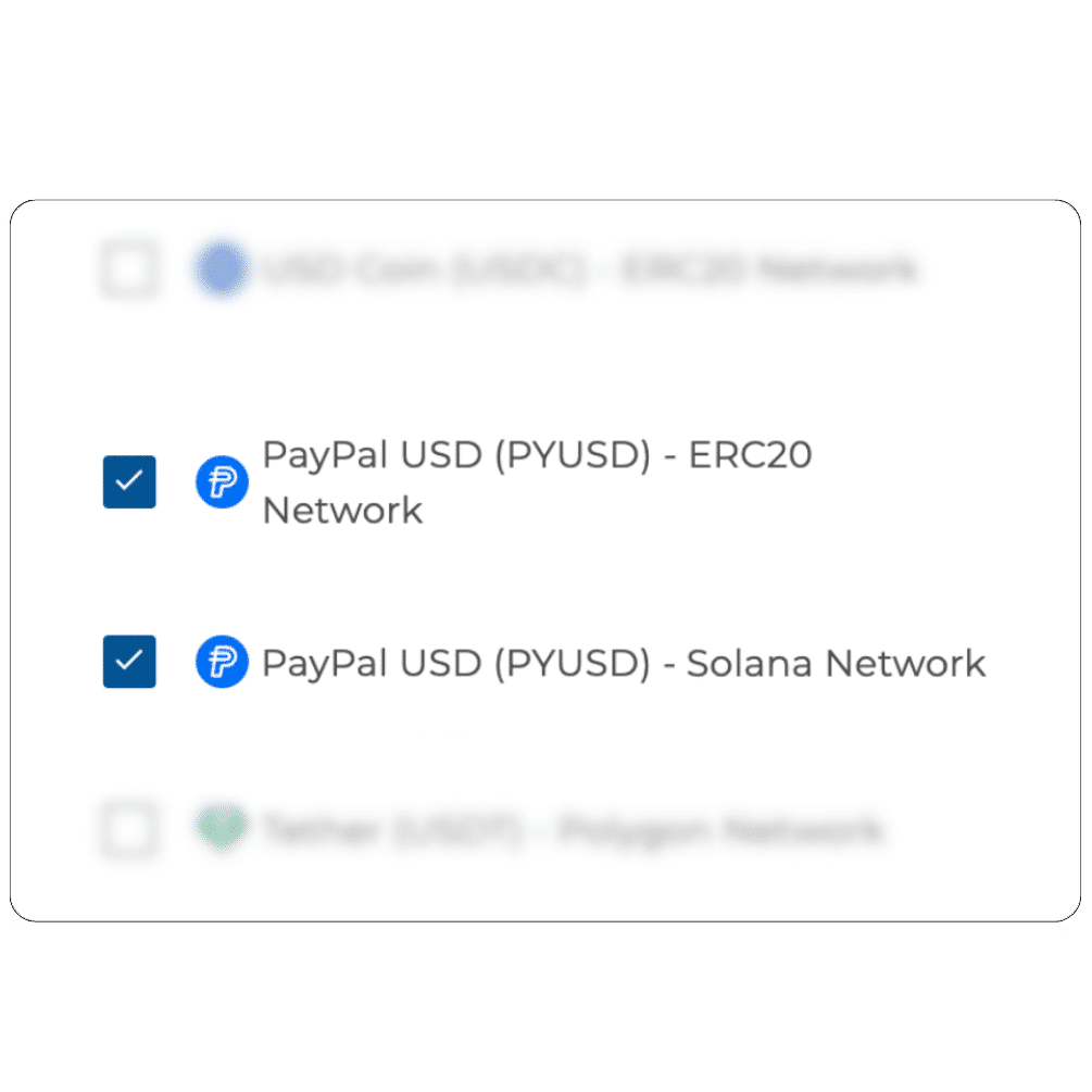 Currently, PayPal USD is available as a payment option on the Ethereum and Solana networks. Additional network integrations are coming soon!