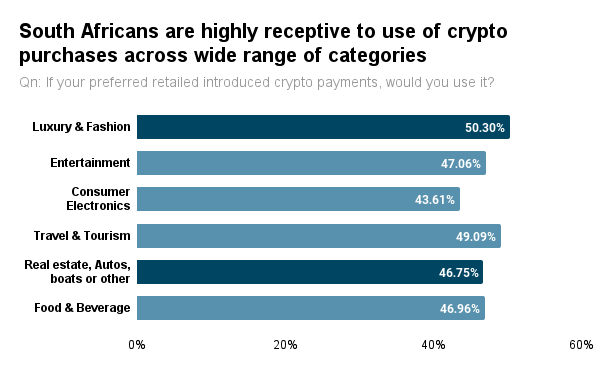 Survey results show that cryptocurrency payment services are eagerly anticipated across the retail industry. South African respondents showed interest in all the major categories ranging from Entertainment, E-commerce and Luxury Retail, etc.