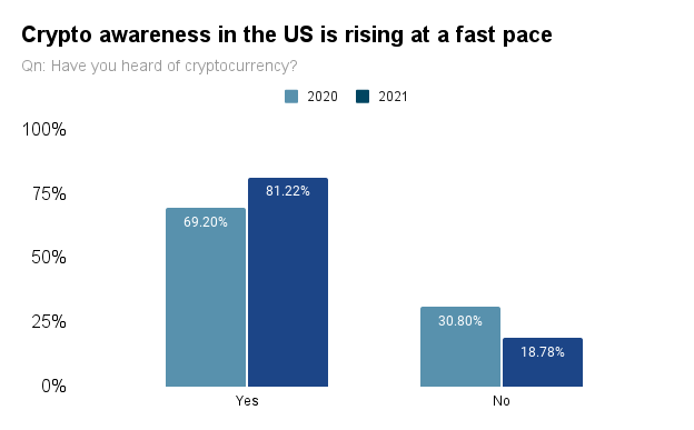 From the survey conducted, we see a staggering 81% of US adults have heard of cryptocurrencies in 2022. We see a significant rise of 12 percentage points, compared to 69% of US adults from 2020. This suggests a growing awareness among Americans regarding cryptocurrency.