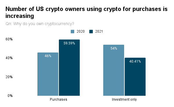 The number of US cryptocurrencies owners using cryptocurrencies for purchases are also seeing rapid growth, with 2021 marking an exponential increase of 14 percentage points (y-o-y growth) in purchases made using cryptocurrency from 46% in 2020.