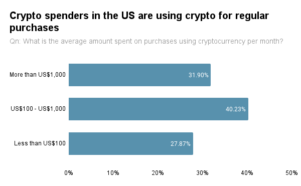 More than 70% of cryptocurrencies spenders are spending more than US$100 of cryptocurrency for purchases monthly, with a significant amount (32%) being large spenders of more than US$1,000 monthly.