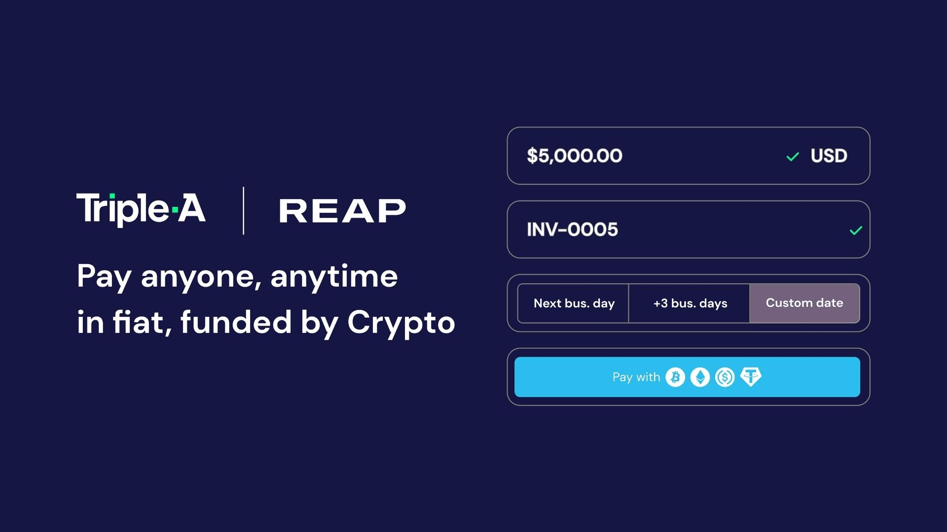Through the integration with Triple-A, Reap Pay offers a one-stop-shop solution for Web3 projects to pay fiat business bills quickly and easily. Reap's users can now settle bank transfer payments directly with Bitcoin (BTC), Ethereum (ETH), Tether (USDT), and USD Coin (USDC), without the hassle of switching between wallets and bank accounts.